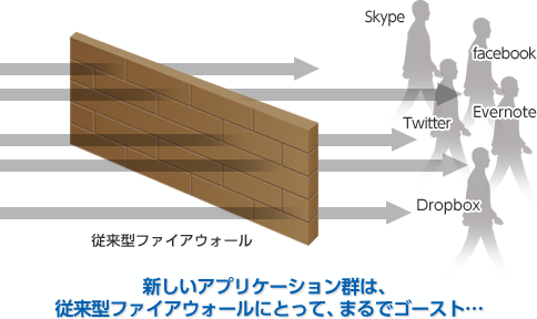 当時は、各アプリケーションがそれぞれルールを守って、ネットワークを利用してきました。たとえば、Telnetは23番ポート、DNSは53番ポート、POP3は、110番ポートというように、それぞれ定められたポートを行儀よく利用していました。従来型ファイアウォールは、ポートの開閉を制御することにより、セキュリティを確保することができましたが、昨今、注目を集めている新しいアプリケーション群(facebook、Dropbox、EverNote、Skypeなど)は、WEBブラウザーで利用する80/443ポートなど、企業活動において閉塞できないポートを利用して通信を実施しています。昨今のアプリケーションは、トラフィックをポートでしか見ない従来型のファイアウォールでは、まったく制御を行うことはできません。