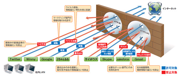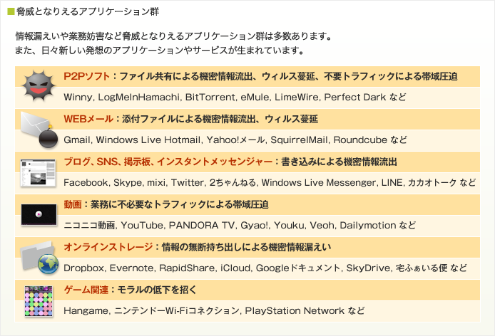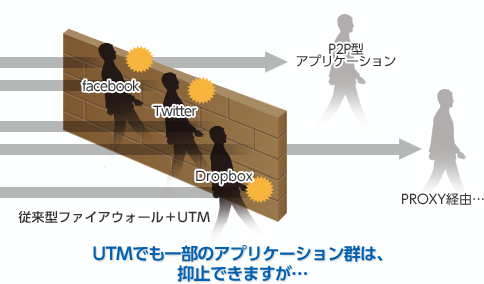 特定のURLへアクセスするアプリケーション(facebook、Twitterなど)は、URLフィルタリングで、接続を抑止可能です。しかし、ネット上に無数にあるプロキシを経由するなど、ファイアウォールを回避することは容易に検討可能です。また、P2P型のアプリケーションなどについては、抑止することはできません。