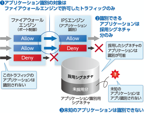 (1)他社製ファイアウォールのアプリケーション識別はUTM機能の一部(IPS(=侵入防御システム)機能)としてサポートしています。IPS機能は、ファイアウォールエンジンで許可されたトラフィックを適用対象とします。つまり、IPSベースのアプリ識別の場合、ファイアウォールで許可したトラフィックが、アプリケーション識別の対象となり、ファイアウォールエンジンで拒否されたトラフィックはアプリケーション識別の対象になりません。ポート偽装して、当該ポートで接続を試みたアプリケーションがあっても、その履歴を把握することはできません。これでは、リスクを把握することはできません。