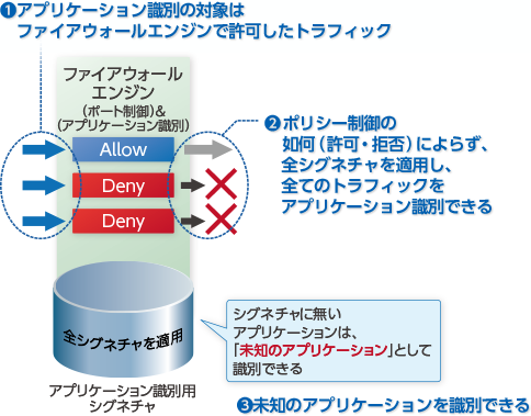 (2)次世代ファイアウォールは、アプリケーション識別用の全シグネチャをデフォルトで適用しています。そのため、シグネチャの選定などの管理作業が不要です。また、全シグネチャの適用を前提にファイアウォールエンジンを開発しており、性能が安定してます。