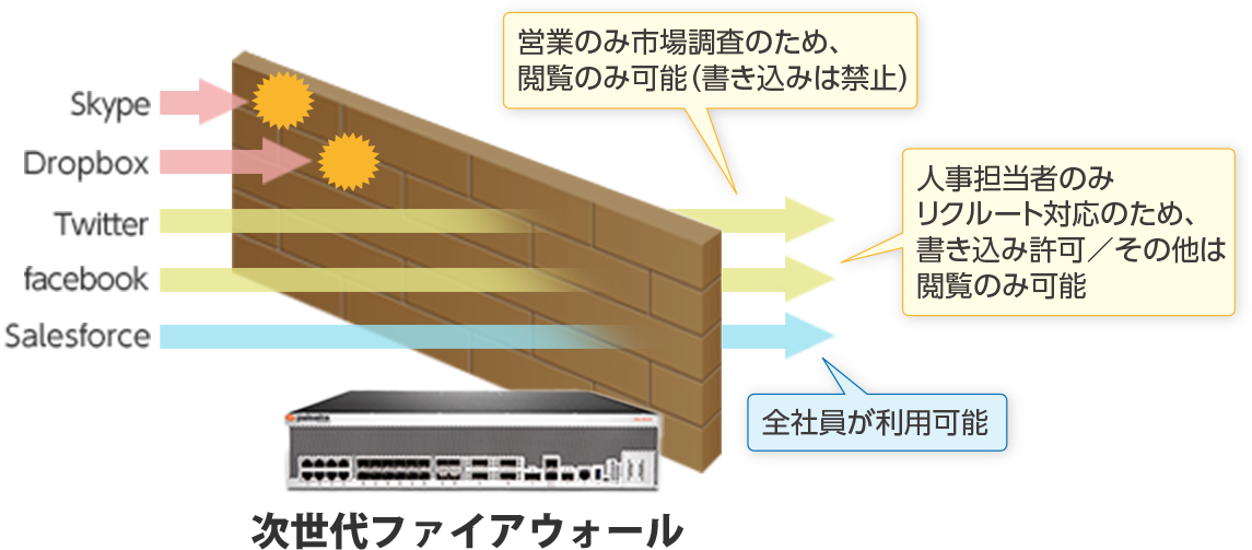 次世代ファイアウォールは、禁止したいアプリケーションを遮断し、認められたアプリだけを特定の利用者に許可することができます。