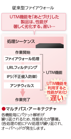 従来型ファイアウォールは、高速なファイアウォール処理(ASIC)にUTMの追加機能を後付けしているため、機器全体の性能が劣化しています。