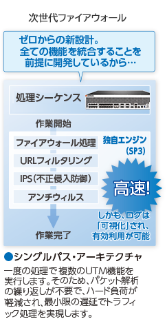 SSGなど従来型ファイアウォールでは、高速なFW処理(ASIC)に低速なUTM処理を後付けした仕組みから、UTM機能利用時は、全体のパフォーマンスが大きく低下しています。また、それぞれの処理プロセスで個別にログが出力されるため、ログも煩雑です。