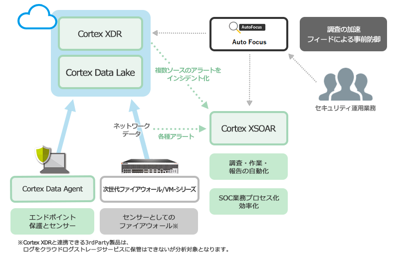 Cortex Data Lakeで収集したネットワーク、エンドポイント、クラウドなどからのデータを分析し、インシデントごとに纏めることで監視の負荷を軽減します。