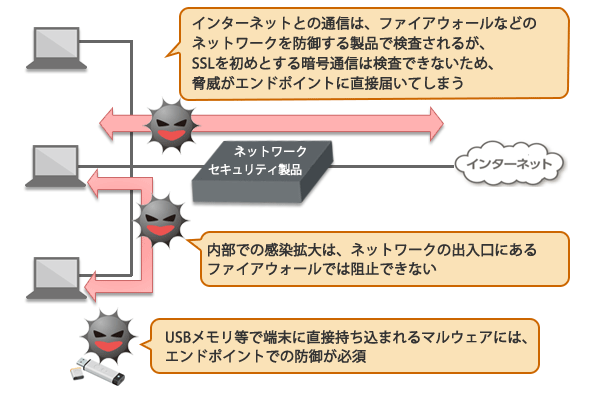 ネットワーク上のセキュリティ対策で、インターネットから侵入する脅威を防ぐことは重要です。しかし、インターネット通信が暗号化されている場合や、感染PCによる内部感染の拡大、またUSBメモリーによる感染など、脅威の侵入経路はさまざまです。