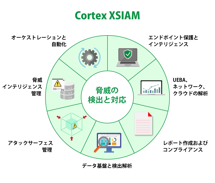 Cortex XSIAM は EDR、XDR、SOAR、ASM、UEBA、TIM、SIEM などトップクラスのセキュリティ運用機能を統合した、AI主導のセキュリティ運用プラットフォームです。AIと自動化を活用したセキュリティ運用の簡素化、既知・未知を問わない効率的な脅威防御、インシデントの早期対応により、アナリストが重大インシデントに注力できるように支援します。