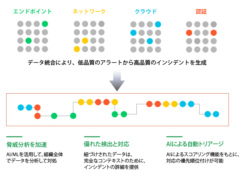 高性能なAI モデルによって多様なデータソースのイベントを関連付けし、インシデントとリスクの全容を一元的に提示します。手動での関連付けと比較して、SOCにおける検出能力、分析能力、レスポンス能力を大幅に強化可能です。また、関連アラートのグループ化機能と AI 主導のインシデントスコアリング機能を用いることで、低品質のアラートから高品質のインシデントを生成し、SOCチームのリソースを効率的に集中させることが可能です。