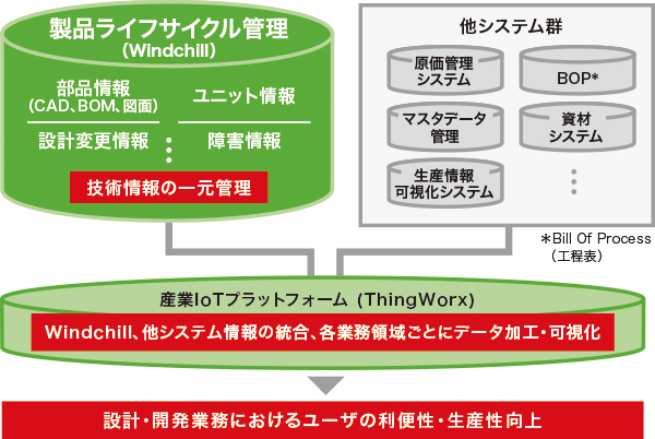 - 設計BOM、製造BOM、サービスBOMを統合した統合BOMを構築し、生産・サービスシステムと連携(Windchill)