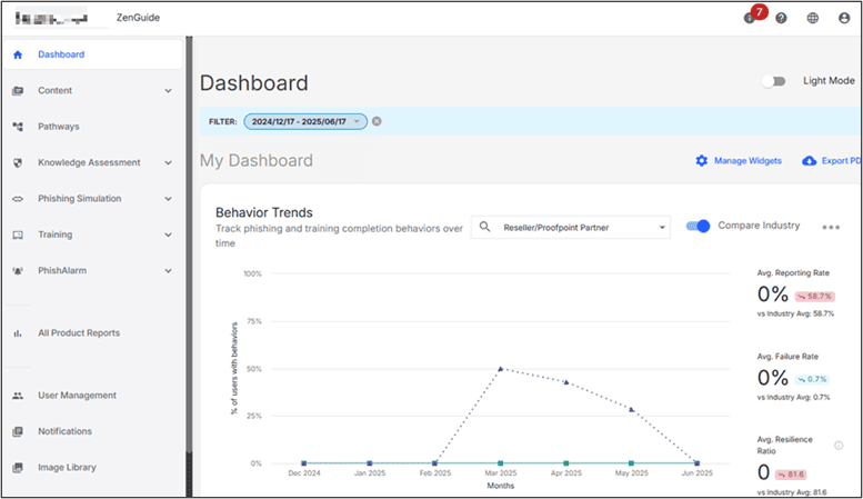 Knowledge Assessment、Phishing Simulation、トレーニングモジュール、Report Suspicious など各モジュールの実行結果をダッシュボードという形で可視化します。これにより定量・視覚的に結果を確認することができます。