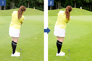 白戸プロ 「手前のクラブがスタンスのライン。遠い方が飛球線。目標方向です。この2本のレールを意識してください。そして、オープンスタンスで構えてください。」
