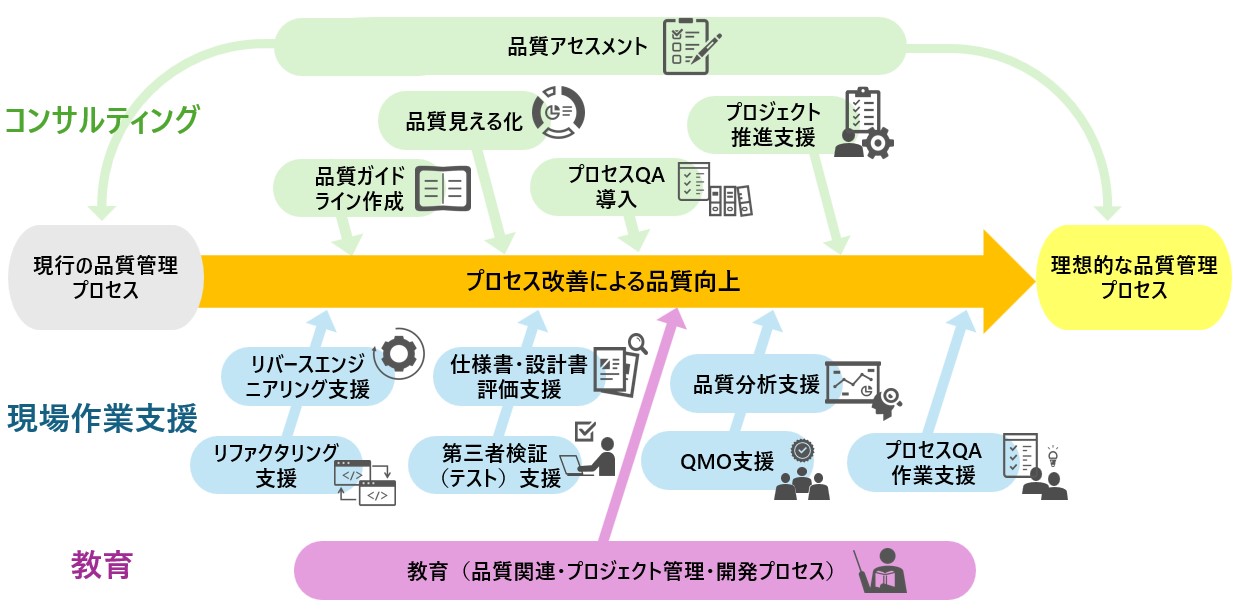 「ソフトウェア品質向上ソリューション」は、日立ソリューションズがこれまで培ってきた品質管理のノウハウをもとに、統合的な品質向上のための施策を体系化したものです。お客さまが抱える品質に関するさまざまなお悩みを幅広く解決します。