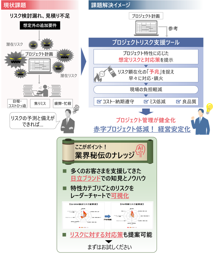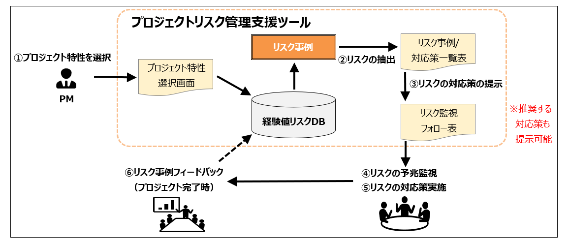 プロジェクトで想定されるリスクや対応策を、長年のリスク事例が蓄積された経験値リスクDBより自動提示し、プロジェクトのリスク管理および品質管理業務を支援します。