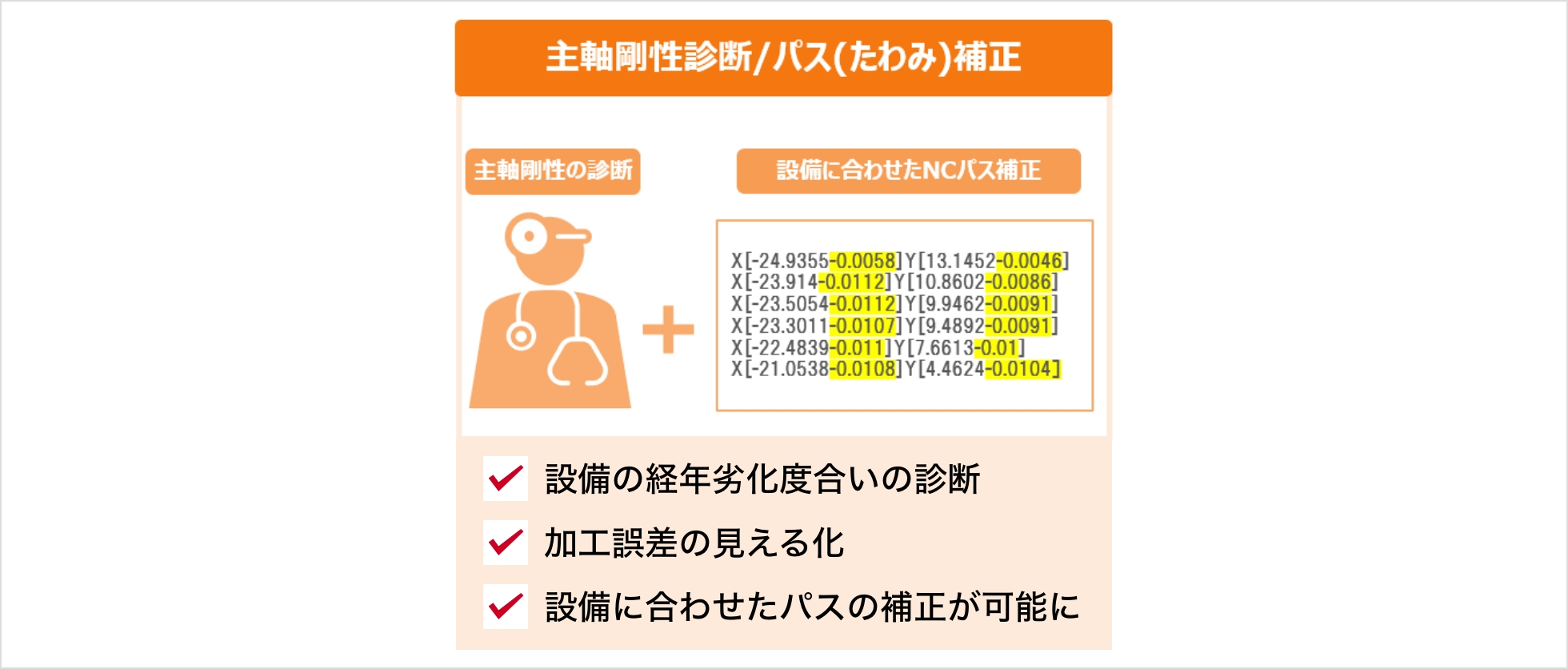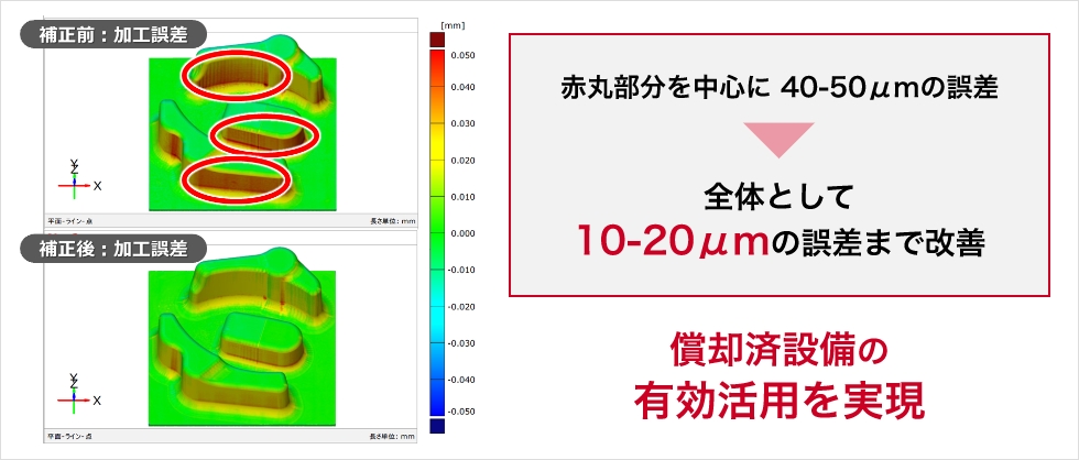 NCデータを補正することで加工誤差が平均33%改善。償却済設備でも高精度加工が実現できるため、稼働率を向上可能。