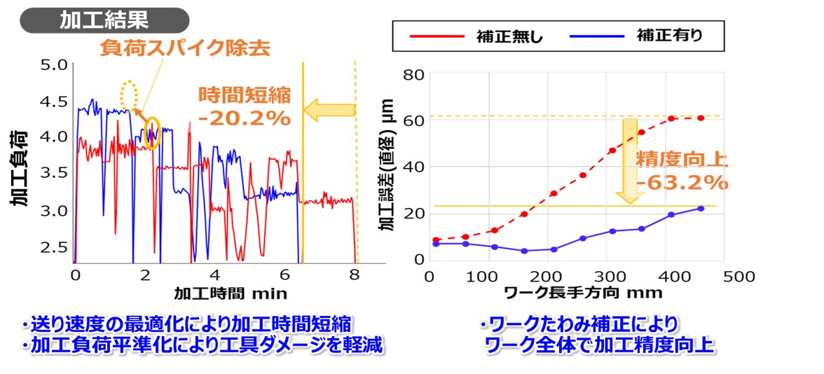 加工負荷に応じて工具の送り速度を自動修正することで生産性が向上。また、加工負荷平準化により負荷スパイクを除去することで工具ダメージを軽減。Step1で測定した結果をもとにワークたわみ補正を実施することで、ワーク全体の加工精度が向上し、加工精度と生産性の両立を実現。
