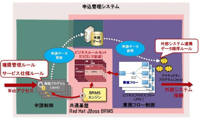 お客様からのサービス申込受付や契約管理、顧客管理、サービス提供までを実施するシステムにおいて、JBoss Enterprise BRMS Platform(以下,JBoss BRMS)を採用しました。