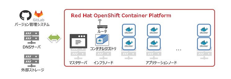 また、OpenShiftを利用する際は、ソースコードを保管するためのバージョン管理システムや、外部からコンテナへアクセスするためのワイルドカードに対応したDNSサーバー、コンテナのイメージやアプリケーションデータなどを格納するためのストレージが別途必要になります。