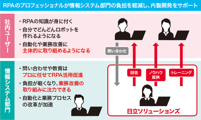 また、業務ユーザーからの問い合わせ対応を日立ソリューションズが引き受けたことにより、情報システム部門に負荷をかけることなくユーザー自身が主体的に問題解決に取り組むようになったことも大きな変化です。情報システム部門は問い合わせ対応が減少しただけでなく、業務ユーザー自身にもRPA化のナレッジが蓄積されていき、結果として内製化が加速。業務改善のアイデアが成果につながる喜びは、本人のモチベーションにもなっています。