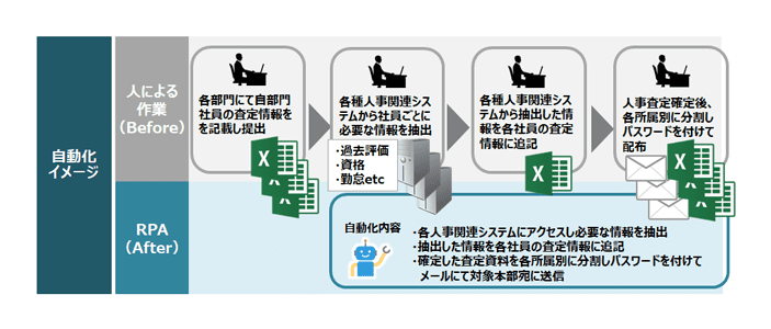 - 社員ごとに各種人事関連システムを検索し、抽出した情報を既定のExcelフォーマットに転記しているため、ヒューマンエラーへの懸念と30人日の作業時間が課題