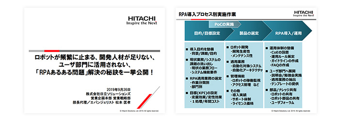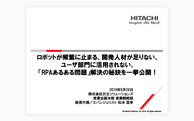 日立ソリューションズは、「「ロボットが頻繁に止まる」、「開発人材が足りない」、「ユーザ部門に活用されない」「RPAあるある問題」解決の秘訣を一挙公開」の題目で講演実施。約560名の方にセッションをお聞き頂きました。当日の講演資料もダウンロードできます。