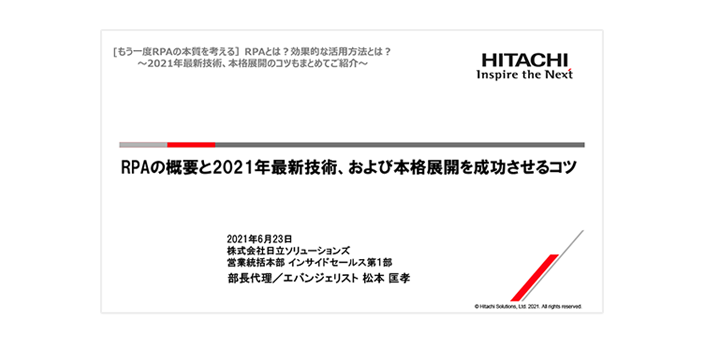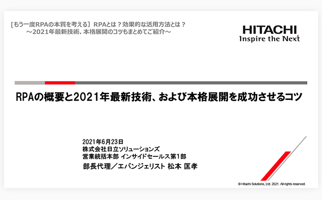 2021年6月23日に開催したオンラインセミナー「[もう一度RPAの本質を考える]RPAとは?効果的な活用方法とは?~2021年最新技術、本格展開のコツもまとめてご紹介~」のオンデマンド版を公開します。