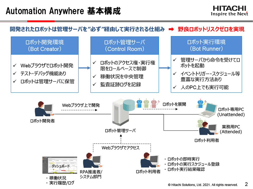 「Automation A360」は、管理されたロボットは管理サーバーを必ず経由して実行される仕組みになっています。