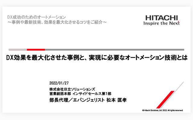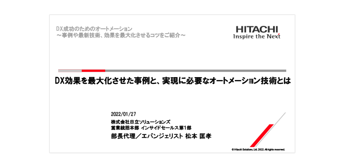 2022年1月27日に開催した日立ソリューションズグループのオンラインセミナー「DX成功のためのオートメーション~事例や最新技術、効果を最大化させるコツをご紹介~」のオンデマンド版を公開します。