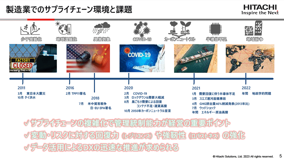 サプライチェーンの複雑化で、管理統制能力が経営の重要なポイントとなっており、変動やリスクに対する回復力や強靭性の強化と、データ活用によるDXの迅速な推進が求められています。