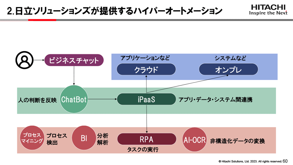 ハイパーオートメーションとは、RPAやAI、機械学習、プロセスマイニング、iPaaS製品といった複数のテクノロジーを活用したエンドツーエンドの自動化を指します。これまでは、業務自動化といえば定型業務などの作業を自動化するというものと認識されていましたが、日立ソリューションズが提供するハイパーオートメーションは、「場所を選ばず、完全な業務自動化」の実現です。