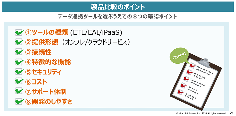 実際にデータ連携を選ぶ段階になると、さまざまな製品を比較することになりますが、その際、確認するべきポイントが8つあります。