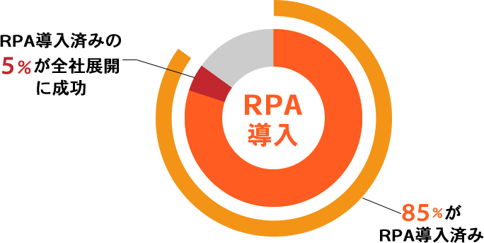 85%の企業がRPA導入済みとはいえ、全社でRPAを活用できているのはそのうち5%にすぎません。(※RPA BANK調べ)