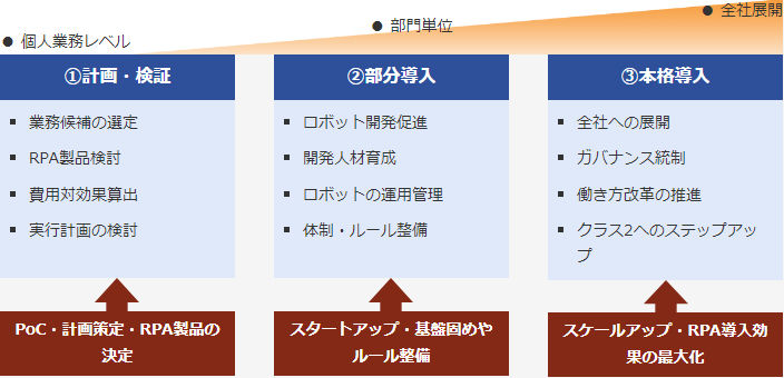 フェーズ3に入ると、いよいよ全社展開です。フェーズ2で固めた基礎をベースに本格導入を進めます。ガバナンスをとりながらスケールアップし、全社的でRPAを活用できるようにして導入効果の最大化を図ります。クラス2と言われる、AIと連携したさらに高度な自動化の実現をめざすのもこのフェーズでの取り組みになります。