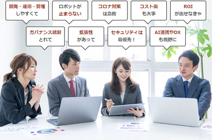 しかしこれらの問題は、RPAツールに管理機能がない、業務に合わない、開発が難しい、などその企業が現在使っているRPAツールに起因していることも多いのです。RPAを全社に本格展開する前に、自社のRPAでそれが可能なのか、一度吟味してみることが重要です。