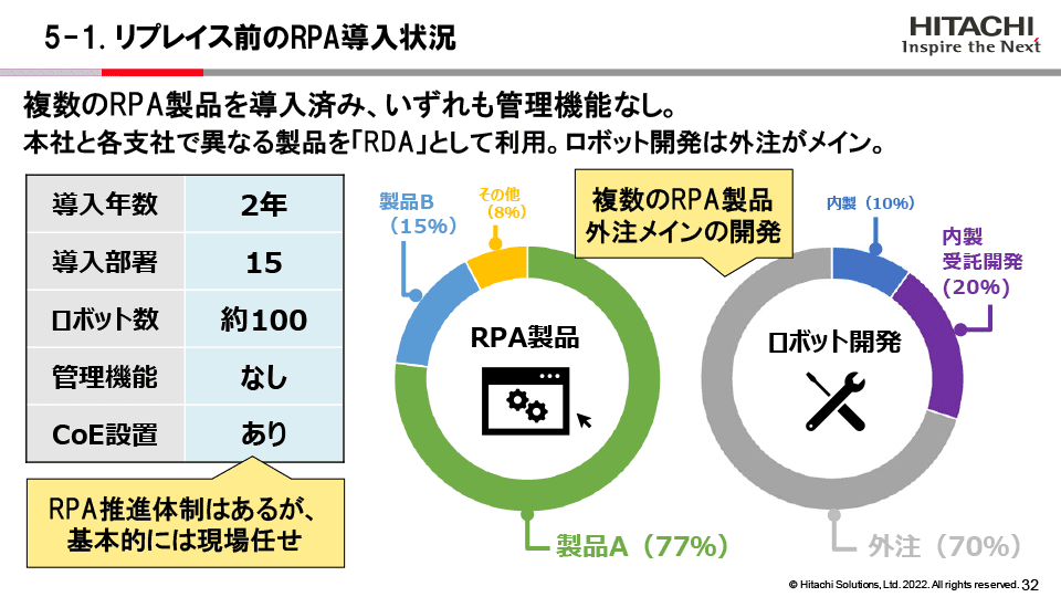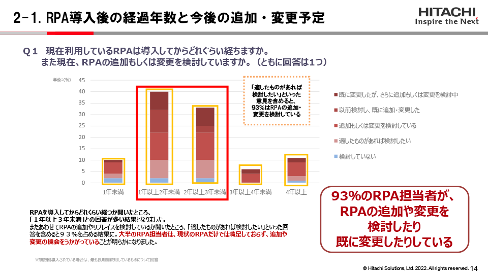 日立ソリューションズの独自調査によると、RPA導入済みの企業の担当者の93%が、RPA製品のさまざまな課題のため、RPA製品の追加や変更を検討しているとの結果が出ています。