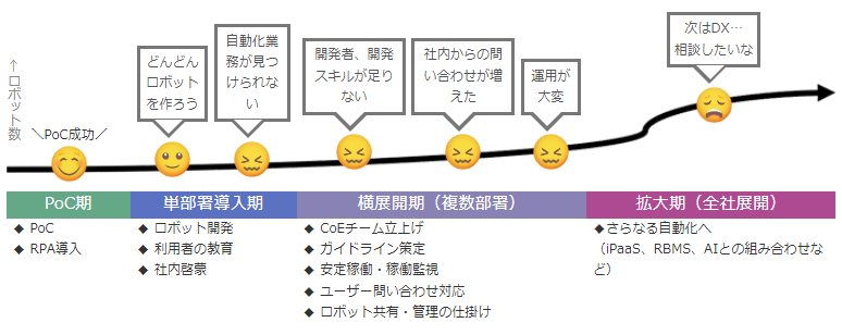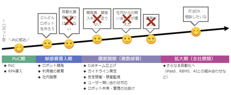 RPA導入から全社展開までの各フェーズで、RPA推進部門が行わなければならない関連業務は多くあります。