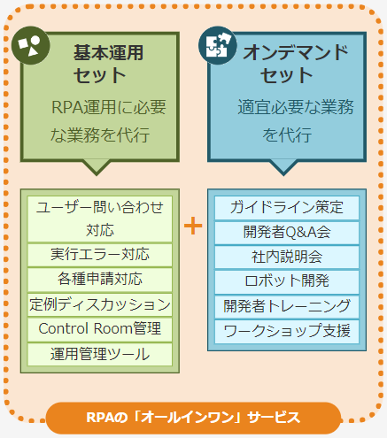 「基本運用セット」は、日常的に必要なRPA関連業務の代行、「オンデマンドセット」は、スポットで必要になる業務の代行です。