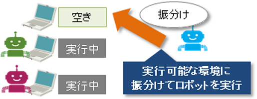 空いてる実行環境にロボットを自動で振り分けます。またロボット実行環境との接続が切れていることを検知、通知することで迅速な復旧を支援します。