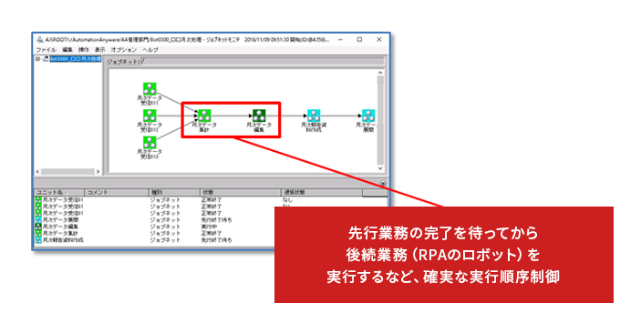 RPAを含む複数のジョブで構成される業務を順序付けして自動実行。実行順序はGUI操作で容易に定義することが可能です。