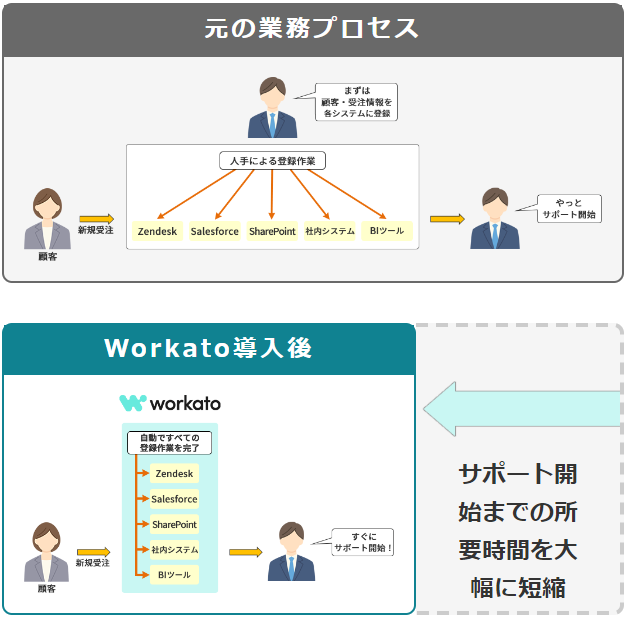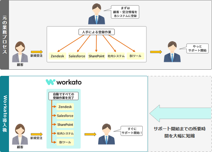 新規受注が発生したら、自動でサポートセンターやバックエンドで使うシステムにユーザー情報を登録