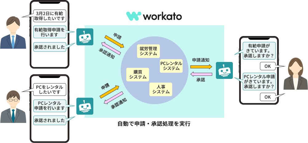 チャット内容に基づき、Workatoがシステム上の申請・承認処理を実行