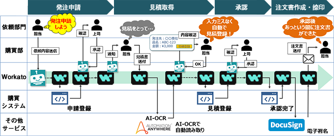 購買依頼から注文書の作成まで、煩雑なプロセスをWorkatoが自動化します。