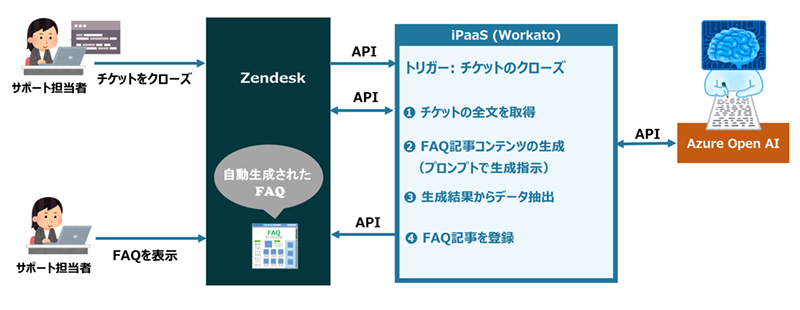 サポート対応のチケットが完了したら、そのチケットの内容をもとにFAQを作成する、という業務を自動化。