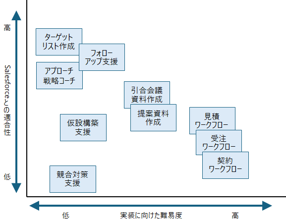 ユースケースに対し、Salesforce上での実装が適しているか(適合性)、および実装にどの程度の工数・技術が必要か(難易度)をマトリクスで評価します 。これにより、「効果が高く、かつ実現しやすい」AIエージェントから導入することが可能になります。