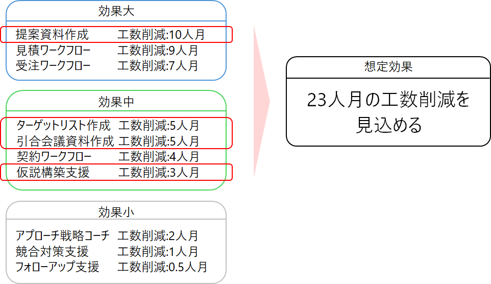 ユースケースの導入効果を定量化し、適合性や難易度を総合的に評価することで、ビジネス価値を可視化します。