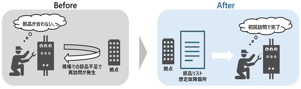 - 保守員は過去事例から故障箇所を推測し、必要と思われる部品を持参。現場到着後に部品が合わず再訪問となるケースが散見。
