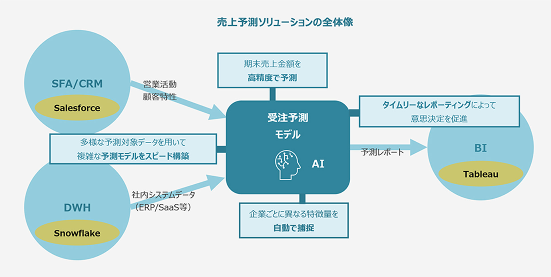 売上予測ソリューションは、売上予測の精度や作業負担で悩む営業マネージャーの課題を解決し、データ駆動型の意思決定を促進させるソリューションです。売上に関連するあらゆる社内データと案件売上との相関性をAIで解析して高精度の予測モデルを構築します。データの取得から予測のレポーティングまでの売上予測プロセスを自動化し、売上予測プロセスを大幅に効率化します。売上確度を予測することが可能なため、対応優先度をつけることが可能となります。