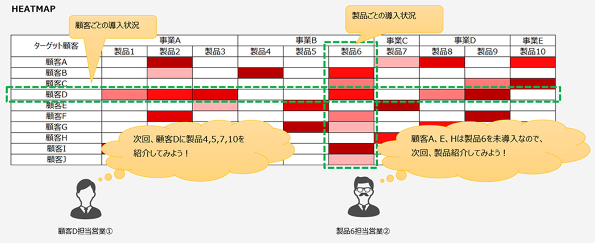 自社のどの製品が、どの業種・業界・顧客に対し導入されているかを可視化することでホワイトスペースの理解や優先アプローチ先の特定を行うことが可能となります。これを用いることで、戦略を洗練し、より受注確度の高い顧客へ優先的にアプローチを行うことを可能にします。