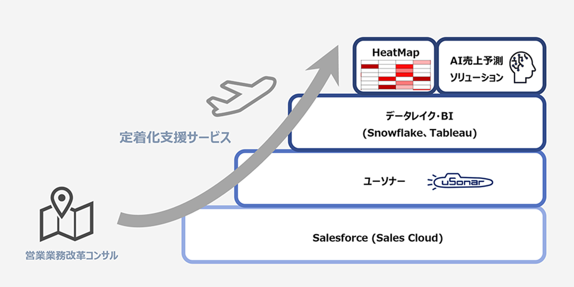 営業デジタル改革ソリューションは、下記の図のような構成になっています。Sales Cloudには、顧客マスタ、お問い合わせ、各種業績情報などを保持します。Sales Cloudのデータに対してユーソナーを使って顧客マスタを整備します。データレイクに蓄積したデータをTableauで可視化し、売上予測やHeatMapといった分析をすることで、営業活動におけるデジタル活用を促進します。当社自身での活用実績を踏まえ、営業業務改革コンサルや定着化支援サービスでお客さまのゴールまでナビゲートします。(お客さまが必要とする要素をご提案、ご提供します。)