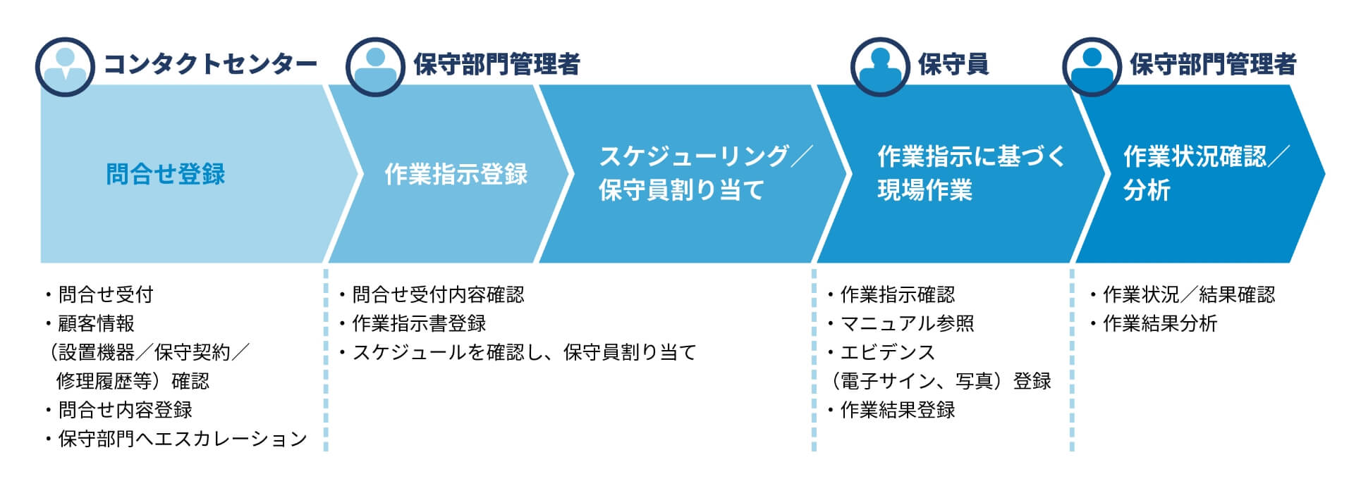 ベテラン保守員の退職による技術力低下。新人など保守業務に慣れていないメンバーの作業品質向上。現場作業の状況、全体進捗状況の迅速かつ正確な把握。CRMを活用し顧客要望・状況、対応ナレッジ、必要部品 といった人・モノ・情報をつなぐことで、応対品質の向上を実現し、初回訪問での解決率の向上や顧客満足度の向上を図れます。
