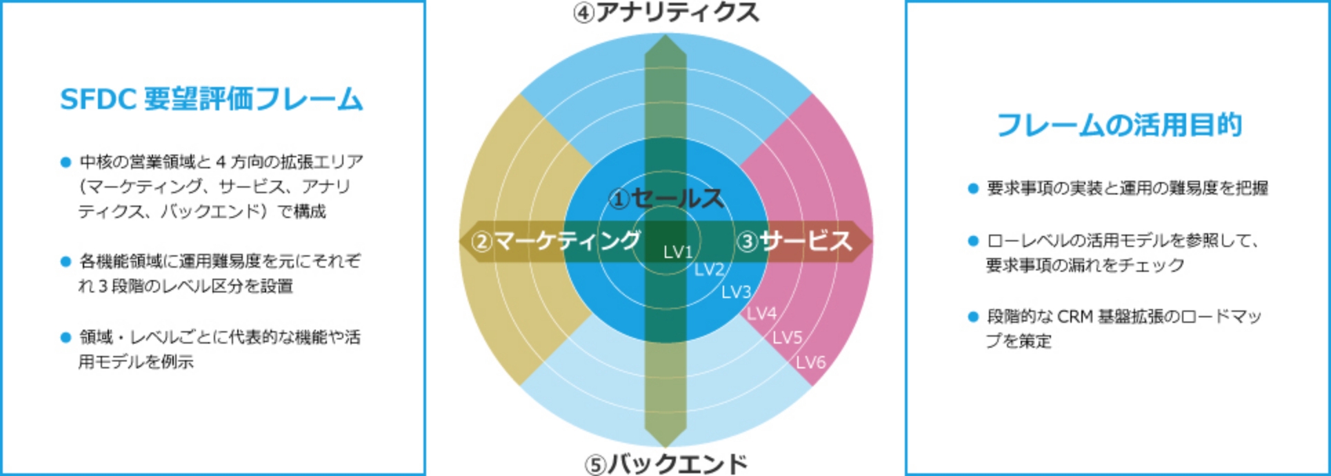 Salesforceを導入し、DXを実現するためは、社内の合意形成が重要かつ必須です。経営視点、営業視点、顧客・業務管理視点など、さまざまな視点からソリューション構想を支援します。