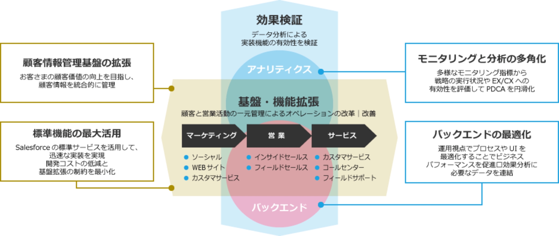 当社での長年の実績・試行錯誤をベースに作られた営業生産性の向上、継続的な事業伸長を達成するための営業業務プロセス改革メソッドとデータドリブン基盤を組み合わせて提供します。